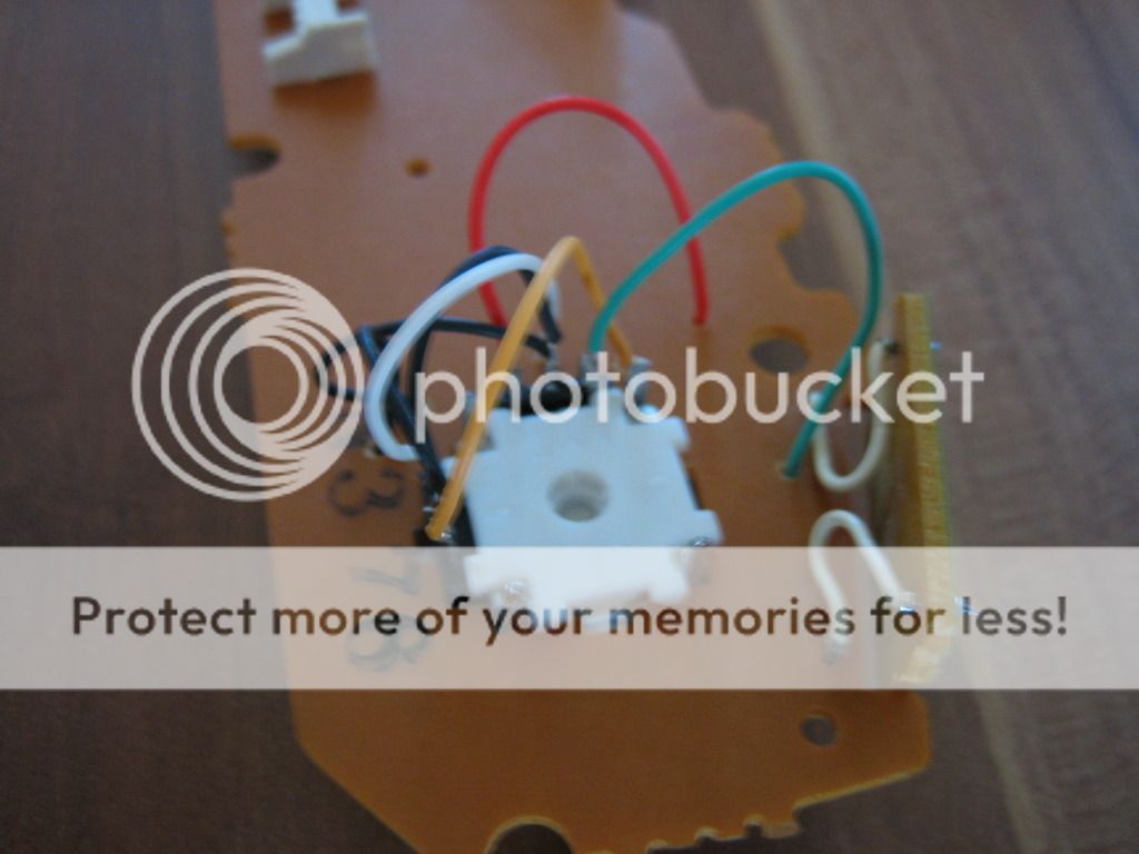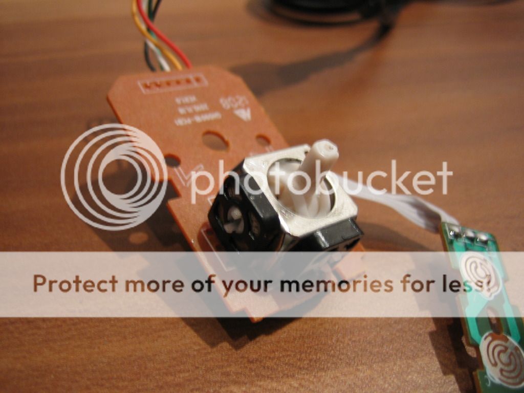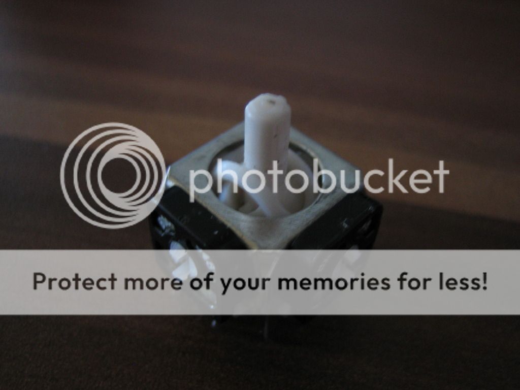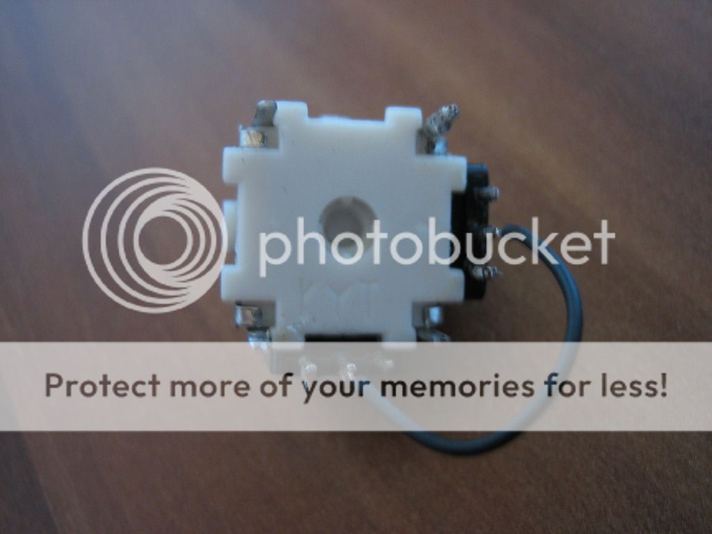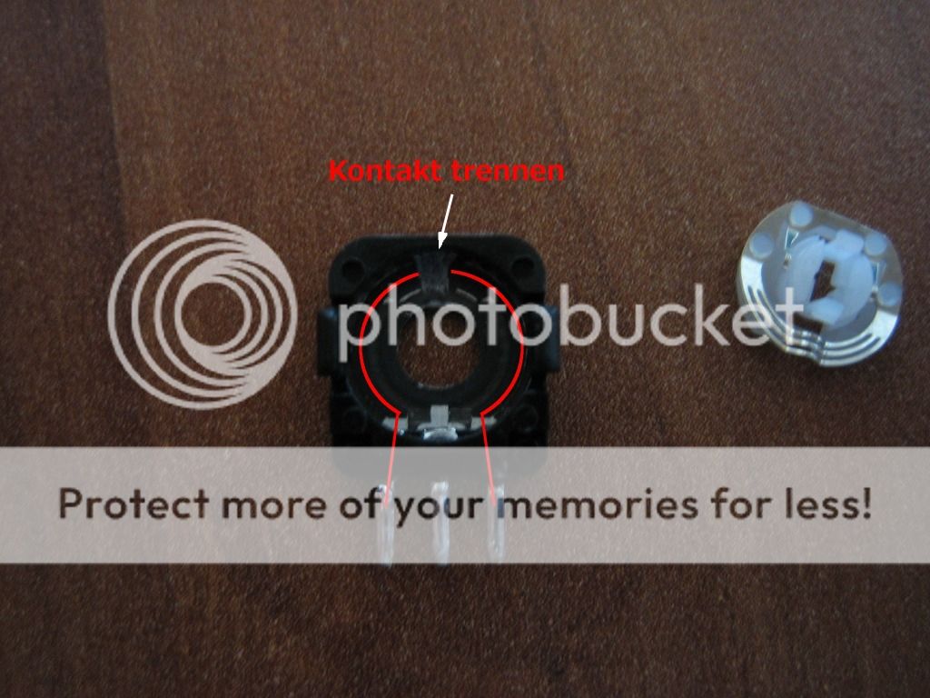 So nun wird es etwas knifflig wir müssen nun aus unserem Analogstick einen Digitalstick machen. Dafür müssen wir die zwei schwarzen Kappen seitlich entfernen ( seid dabei sehr vorsichtig) die Kappen sind an den Korpus in dem der stick gelagert ist eingeklippt. Mit leichtem Druck auf die Klipps lassen sie sich heraus nehmen. wenn ihr sie vor euch liegen habt müsst ihr noch die Kontaktscheibe auf der Rückseite heraus nehmen. Drückt dazu ganz leicht auf die Nasen auf der Vorderseite. Wenn ihr das habt müsste es wie folgt aussehen.