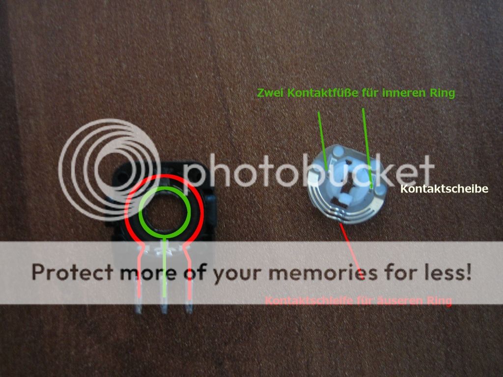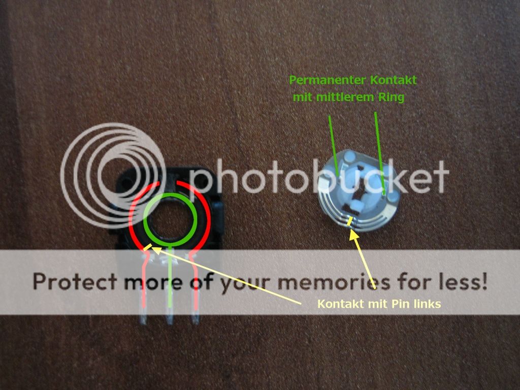 Das ganze funktioniert folgendermaßen der äusere Ring ist mit dem linken und dem rechten Pin verbunden. Der innere mit dem mittleren. In zusammengebautem Zustand funktioniert die Kontaktscheibe wie ein Schalter. Sie schließt den Keislauf entweder zur rechten oder linken Seite. Hier im Bild als Beispiel zur zum linken Pin