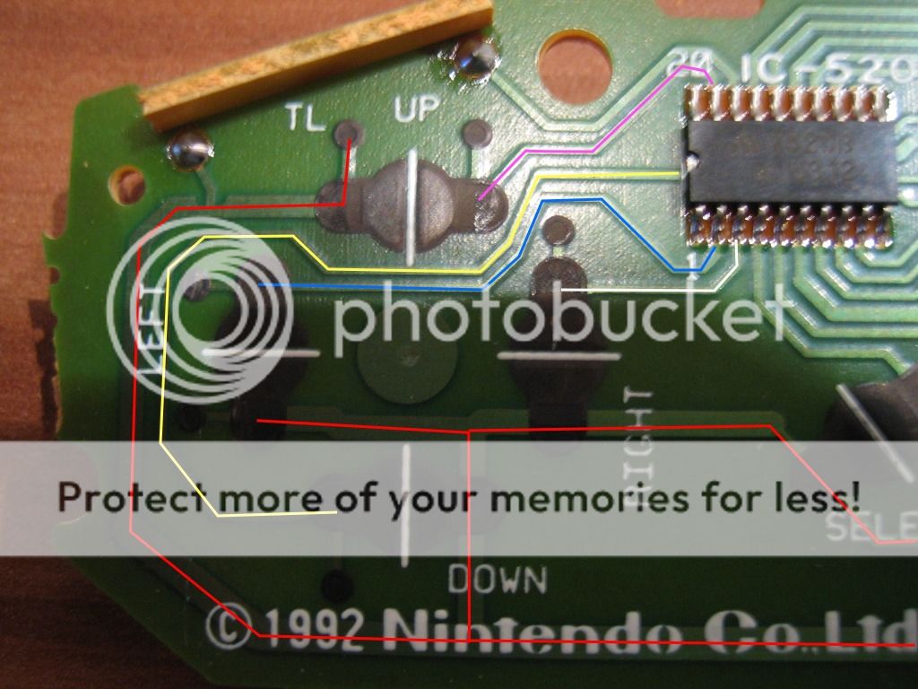 Hier sehen wir die für uns wichtigen Leiterbahnen. Die rote nenne ich jetzt mal Hauptleitung sie verbindet alle Knöpfe des Kontrollers. Violett ist die Kontaktbahn für oben Blau für links, Gelb für unten Weis für rechts.